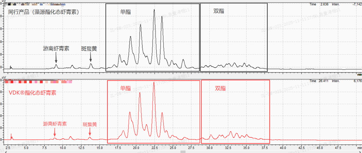 取VDK®酯化态虾青素与同行产品(藻源酯化态虾青素)产品80mg,定溶至100ml,丙酮溶解。
