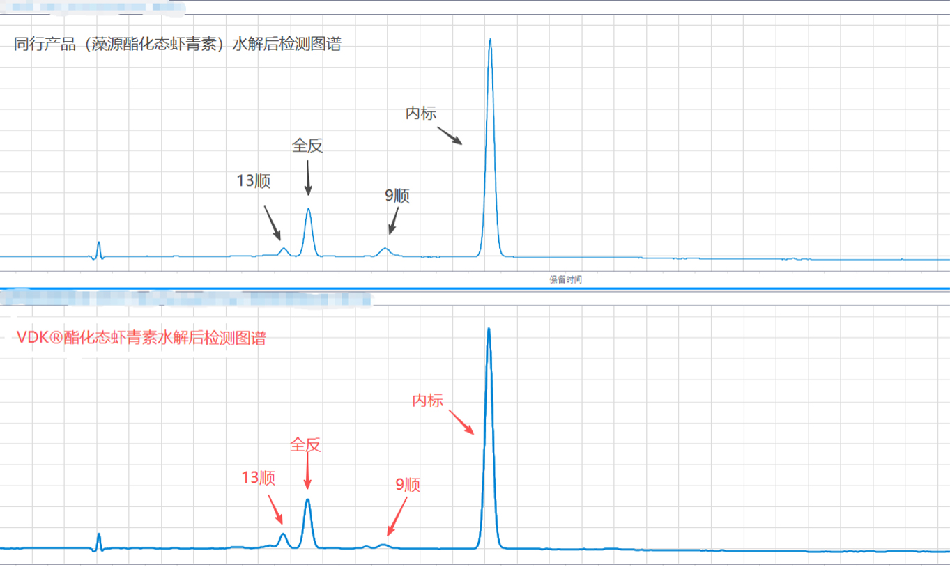 与藻源酯化态虾青素指纹图谱对比,其有效酯化态组分和水解后有效游离态组分结构完全一致!