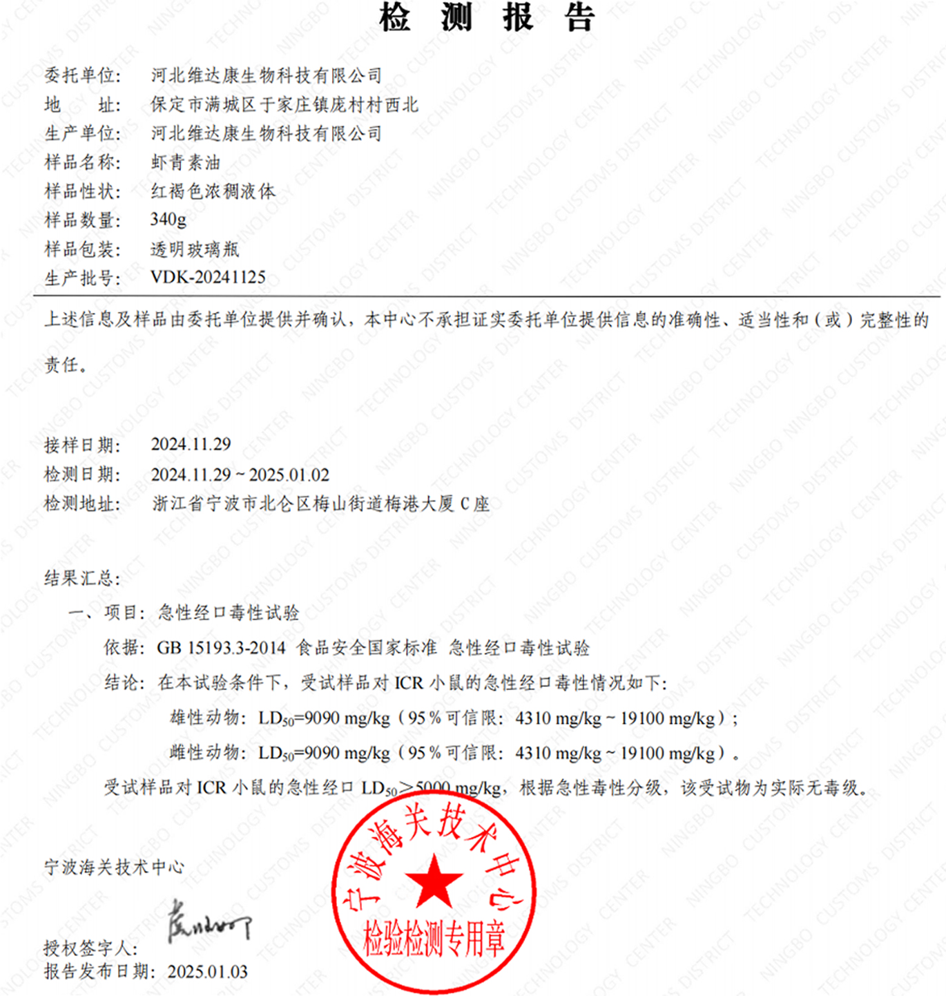 VDK®酯化态虾青素对ICR小鼠的急性经口LD50>5000mg/kg,根据急性毒性分级,本产品为无毒级,多次生物实验,真正做到安全放心!