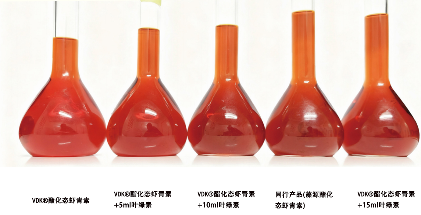 纯、透、亮、艳是VDK®酯化态虾青素的外观特色,无异味,色泽优!