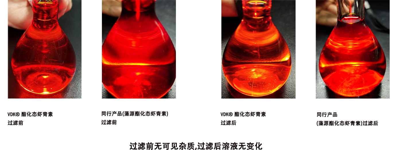 VDK®酯化态虾青素无任何悬浮杂质、沉淀或分层现象,纯粹、干净。