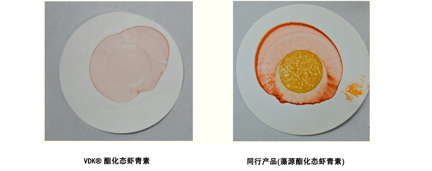 将VDK® 酯化态虾青素与同行产品(藻源酯化态虾青素)进行固型异物滤纸残留对比: