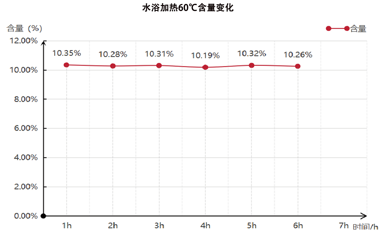 VDK®酯化态虾青素,氮气保护下,60°水浴加热6h,热稳定性良好,含量无降解。