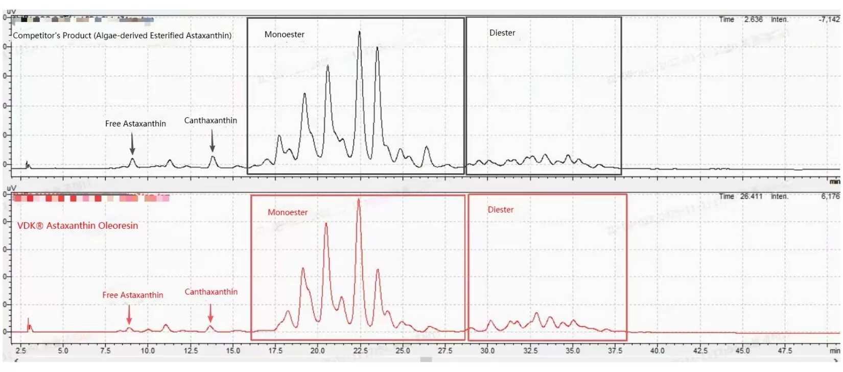 Compared with the fingerprint of algae-sourced astaxanthin oleoresin, the structures of its effective esterified components and effective free components after hydrolysis are completely consistent!