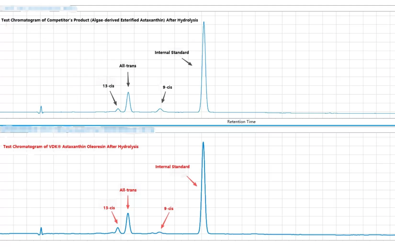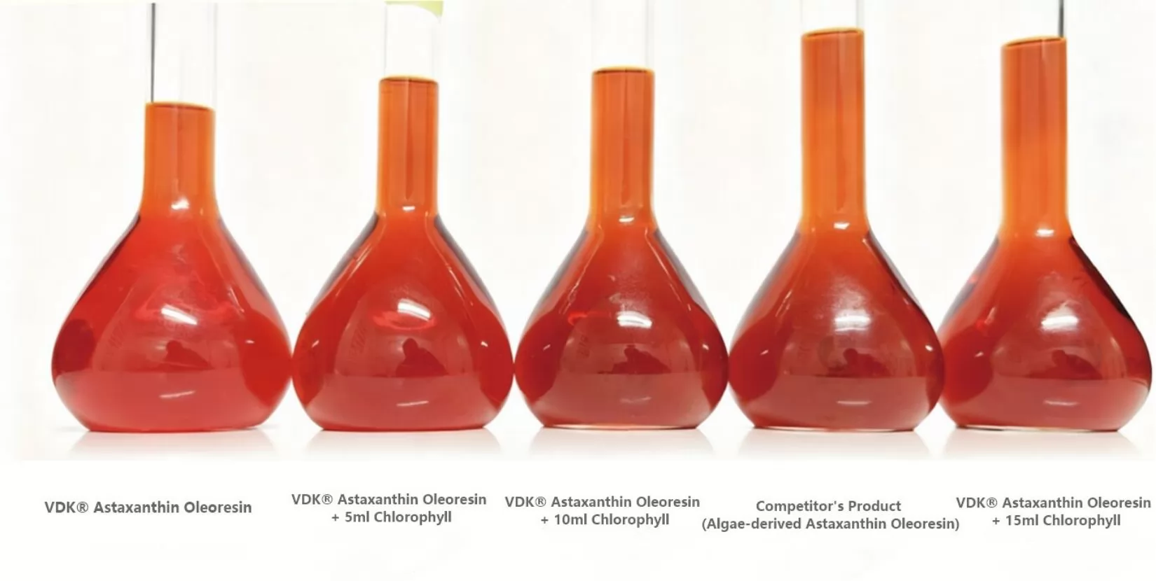 Take 80mg of VDK® Astaxanthin Oleoresin and a peer product (algae-sourced astaxanthin oleoresin), dissolve and dilute to 100ml with acetone.