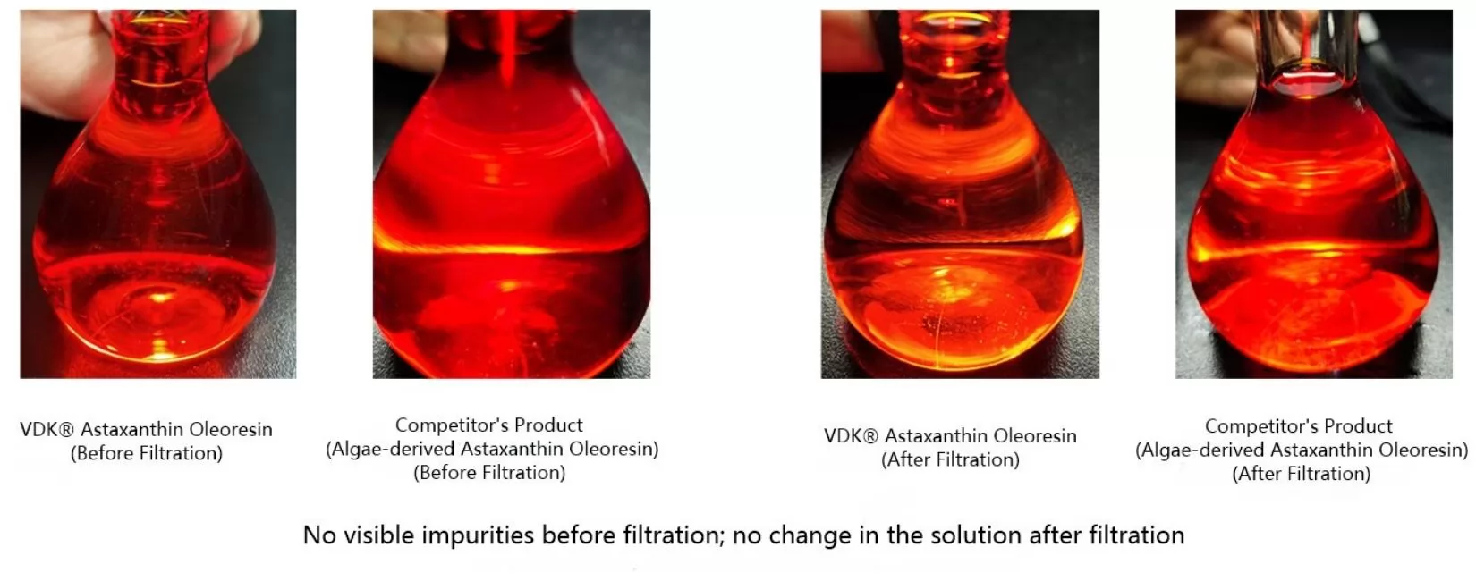 VDK®Astaxanthin Oleoresin has no suspended impurities, precipitates or stratification, being pure and clean.